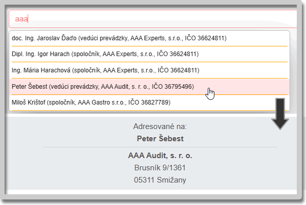 Nasledujúci príklad umožňuje nastaviť ako adresáta zvoleného štatutára spoločnosti.